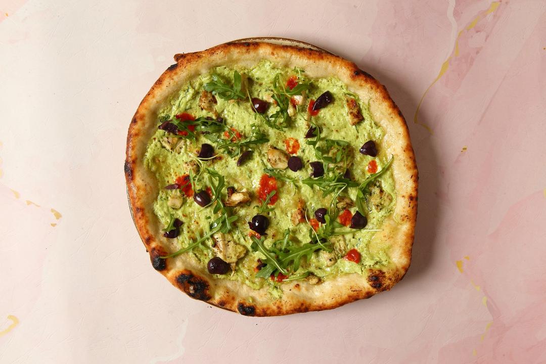 Mix 4 cheese, basil pesto sauce, grilled chicken breast, pomodora, black olives