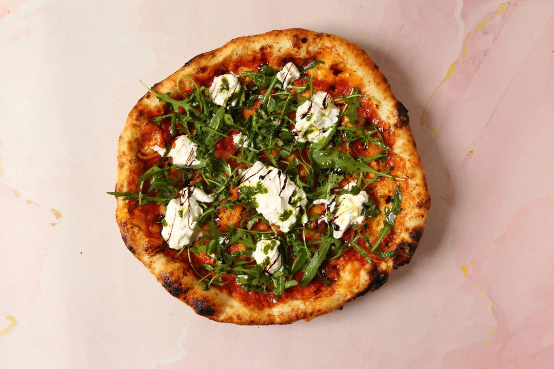 Sour dough signature tomato, Italian fresh Stracciattella, Pomodoro, basil pesto, fresh arugula and sweet balsamic