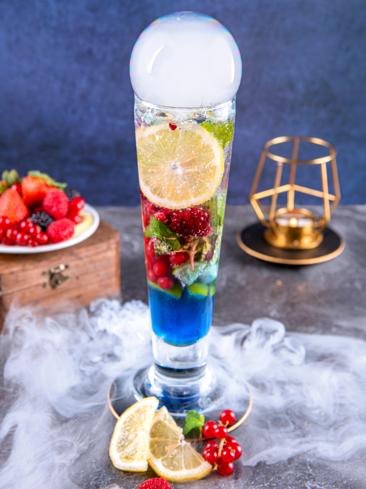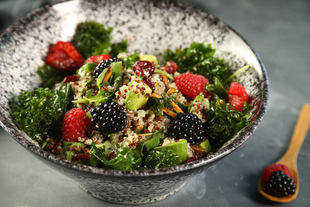 سلطة الكينوا مع تشكيلة من التوت الطازج و شرائح الأفوكادو و المكسرات المحمصة مع عشبة الكيل المقرمشة