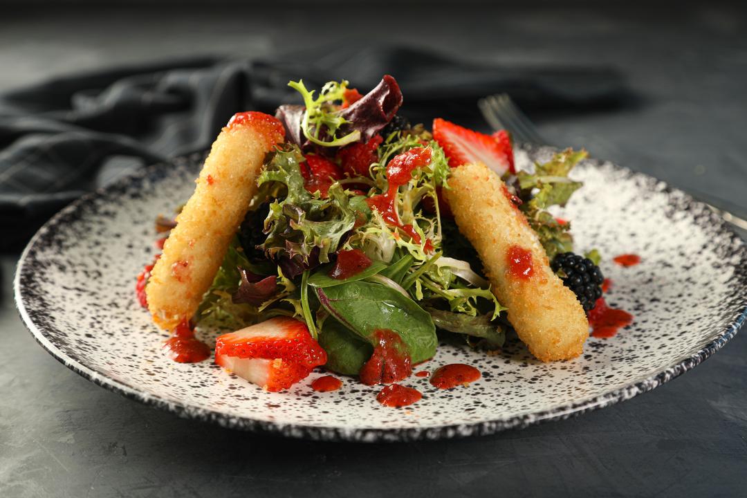 سلطة جبنة االماعز و مزيج التوت مع صوص الفراولة والبندق المحمص