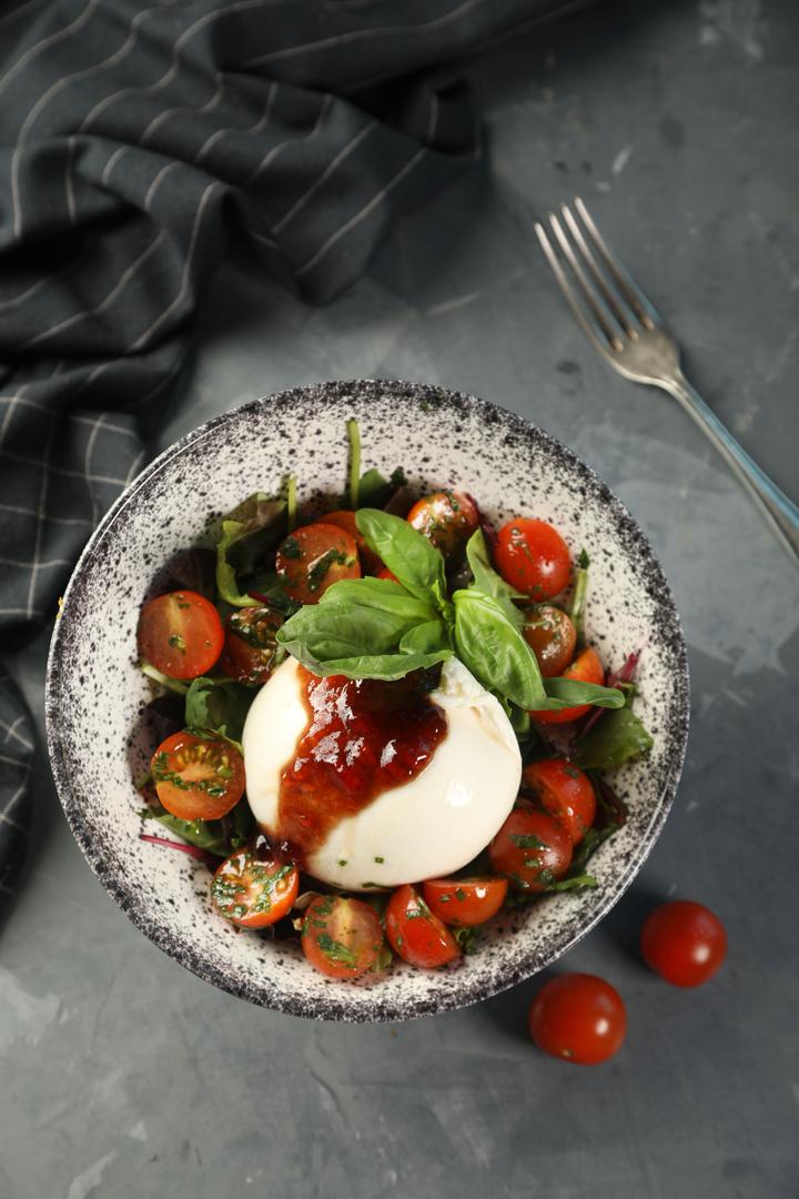 جبنة البوراتا (200 جم) مع الطماطم الكرزية و أوراق الريحان الطازجة و الجرجير الأوروبي و زيت الزيتون البكر