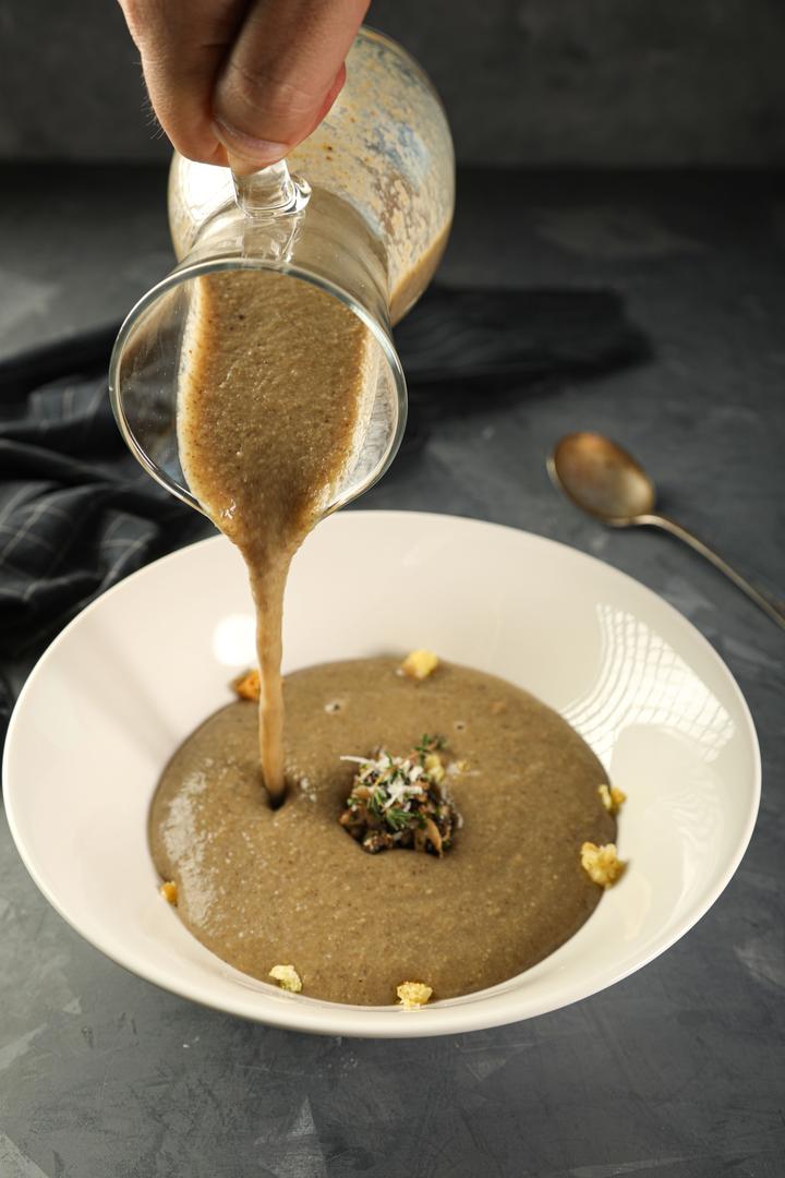 شوربة الفطر الطازج مع باقة من الأعشاب المختارة و جبنة البرميزان