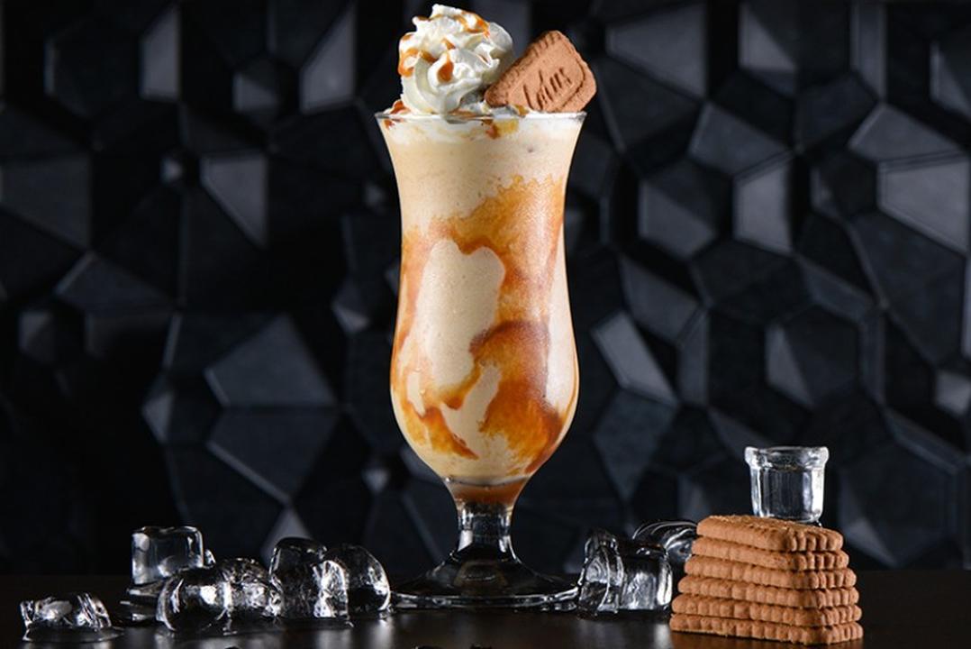بانكيك مع بسكويت اللوتوس المطحون و صوص البسكويت و حبات من التوت المشكل, يقدم مع ايس كريم فانيلا