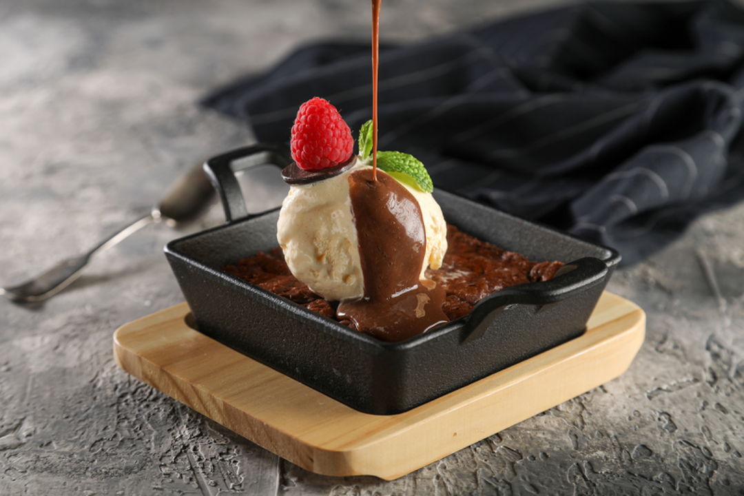 كيكه البراوني من الشكولاته البلجيكية يقدم مع ايسكريم فانيلا