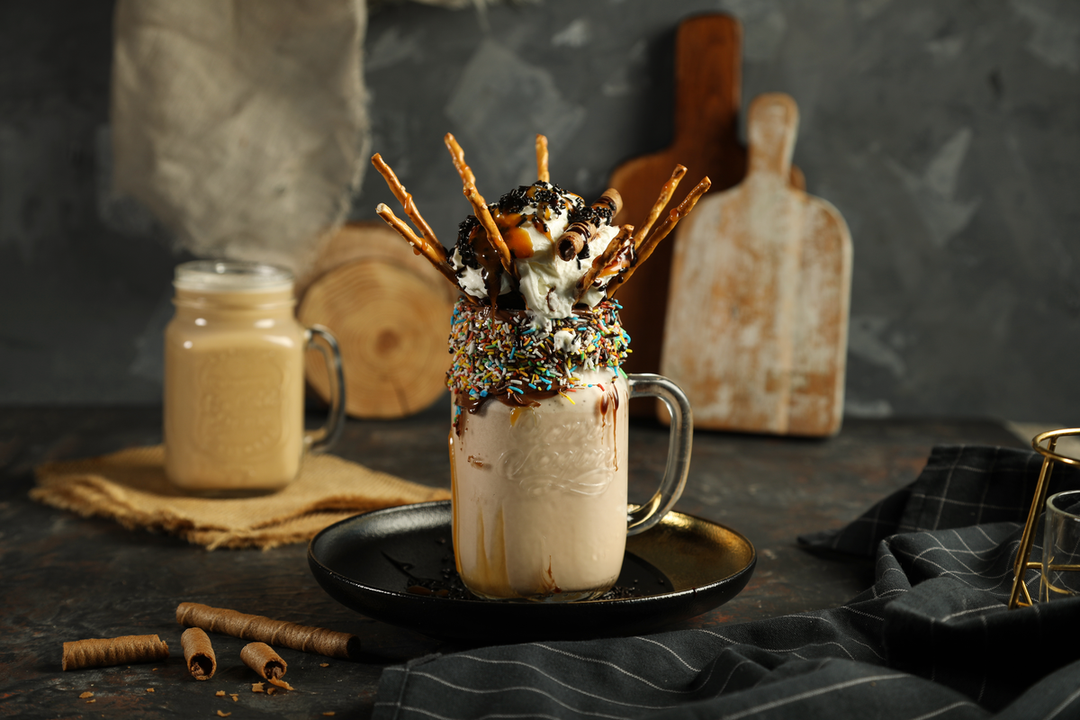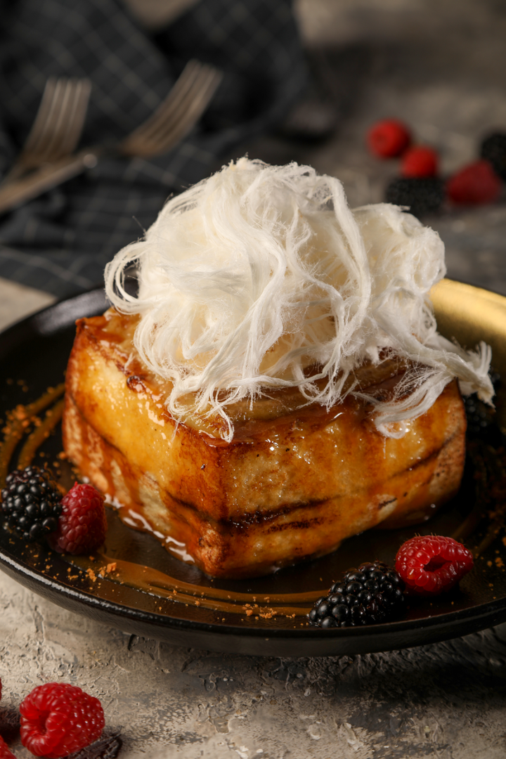 TOAST BREAD, CHOCOLATE HAZELNUT, CARAMELIZED BANANA, SALTED CARAMEL SAUCE, COTTON CANDY SERVED WITH VANILLA ICE CREAM.