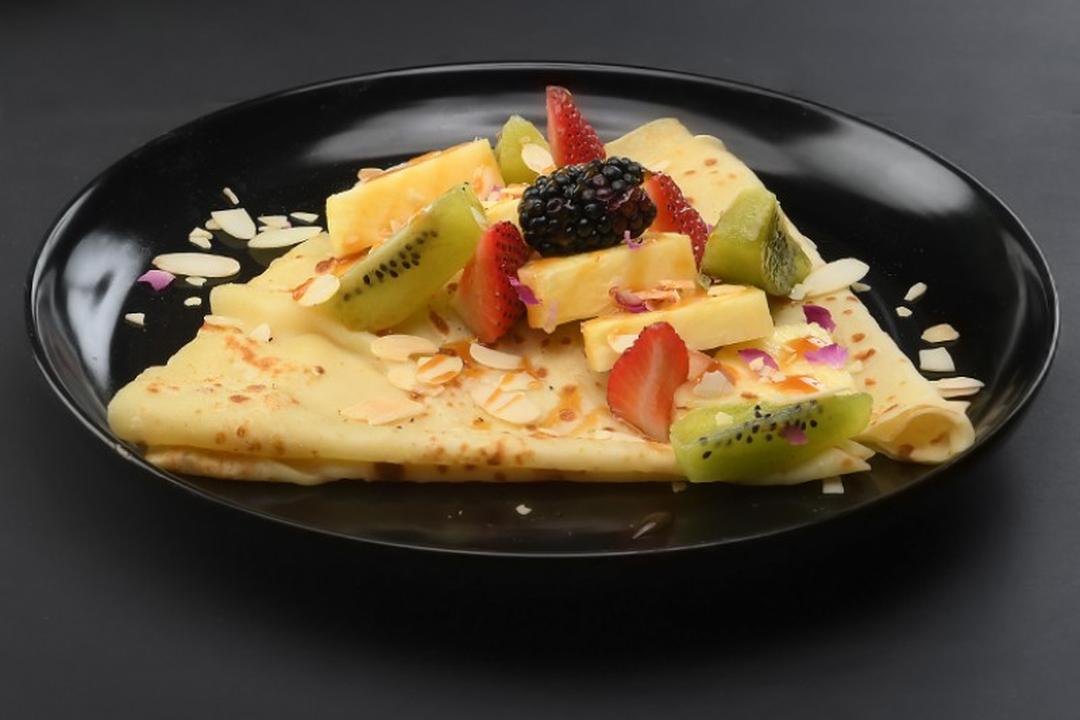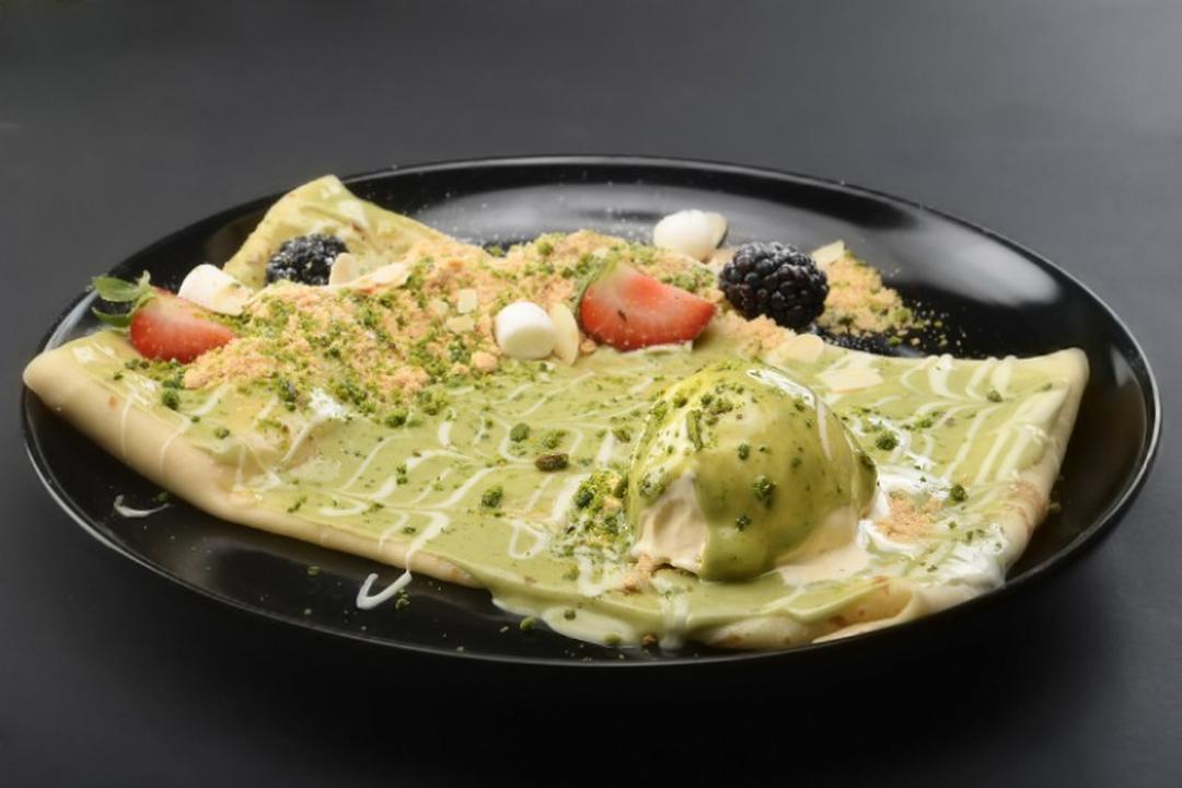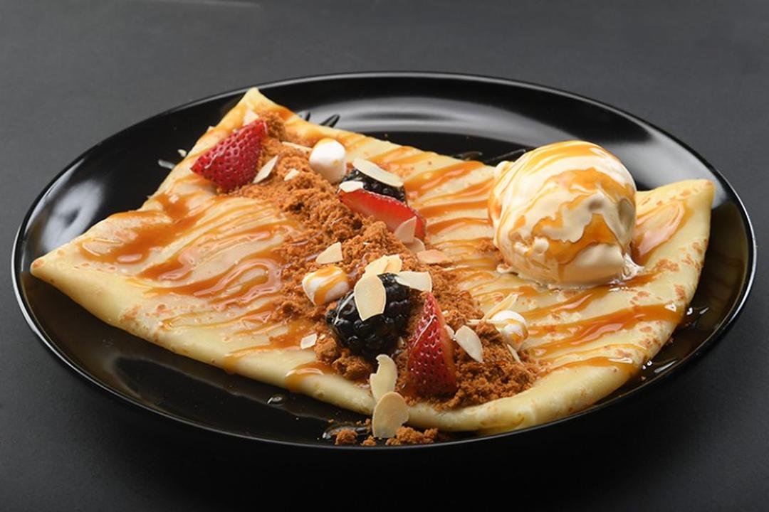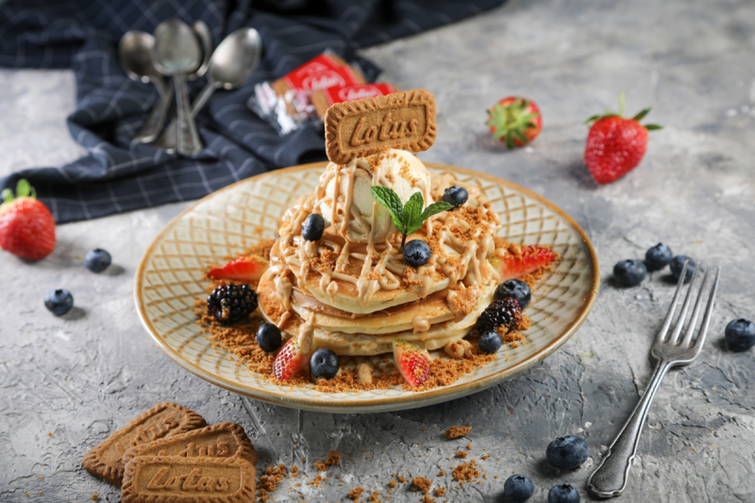 PANCAKES, LOTUS SPREAD, BISCUIT, LOTUS SAUCE MIXED BERRIES WITH VANILLA ICE CREAM.